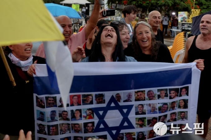 [텔아비브 로이터 =뉴스핌] 장일현 특파원 = 이스라엘과 하마스가 가자전쟁 1단계 휴전안에 합의했다는 발표가 나오자 9일(현지 시간) 이스라엘 텔아비브 '인질 광장'에서 한 인질의 어머니가 감격해 하고 있다. 2025.10.09. ihjang67@newspim.com |