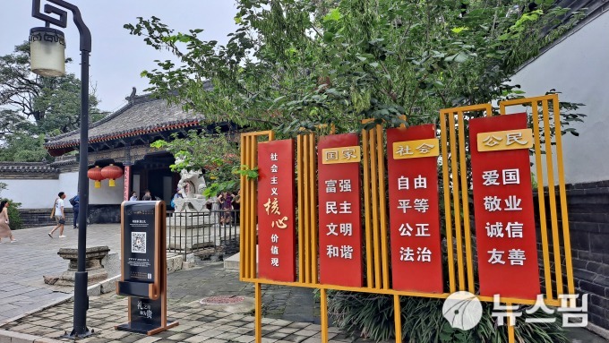 [서울=뉴스핌] 최헌규 중국전문기자= 중국 산둥성 취푸(곡부) 공자사당 앞에 중국 공산당의 통치 이념인 12개 사회주의 핵심가치관이 조형물로 설치돼 있다. 사진= 뉴스핌 촬영. 2025.10.10 chk@newspim.com |