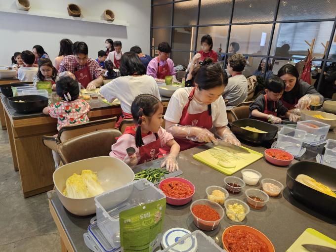 풀무원 뮤지엄김치간은 '종로K축제'에 참가해 다양한 국내외 관람객을 대상으로 특별 김치 체험 프로그램을 운영한다고 밝혔다. 사진은 풀무원 뮤지엄김치간에 방문한 어린이와 학부모들이 김치 만들기 체험을 하고 있는 모습. [사진=풀무원] |