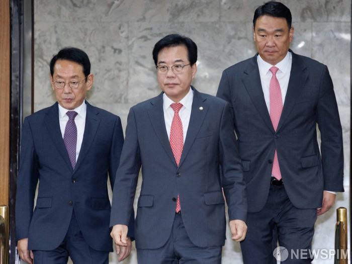 [서울=뉴스핌] 윤창빈 기자 = 김도읍 국민의힘 정책위의장(왼쪽부터), 송언석 원내대표, 정희용 사무총장이가 10일 오전 서울 여의도 국회에서 열린 국정감사 대책회의에 참석하고 있다. 2025.10.10 pangbin@newspim.com