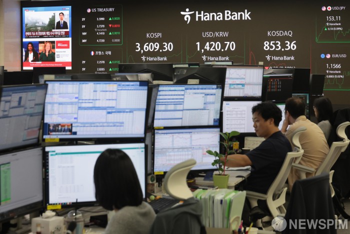 [서울=뉴스핌] 이길동 기자 = 10일 오전 서울 중구 하나은행 딜링룸에 긴 추석 연휴를 마치고 개장한 코스피-코스닥 지수 및 달러/원 환율이 표시되어 있다. 이날 코스피는 전 거래일보다 48.90p(1.38%) 오른 3598.11에 출발해 장중 3600을 넘어섰다. 코스닥 지수는 전 거래일보다 4.61p(0.54%) 상승한 858.86에 거래를 시작했다. 서울 외환시장에서 달러/원 환율은 전장보다 23.0원 오른 1423.0원에 개장했다.2025.10.10 gdlee@newspim.com