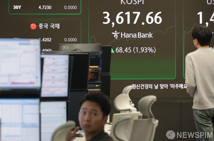 [서울=뉴스핌] 이길동 기자 = 10일 오전 서울 중구 하나은행 딜링룸에 긴 추석 연휴를 마치고 개장한 코스피-코스닥 지수 및 달러/원 환율이 표시되어 있다. 이날 코스피는 전 거래일보다 48.90p(1.38%) 오른 3598.11에 출발해 장중 3600을 넘어섰다. 코스닥 지수는 전 거래일보다 4.61p(0.54%) 상승한 858.86에 거래를 시작했다. 서울 외환시장에서 달러/원 환율은 전장보다 23.0원 오른 1423.0원에 개장했다.2025.10.10 gdlee@newspim.com