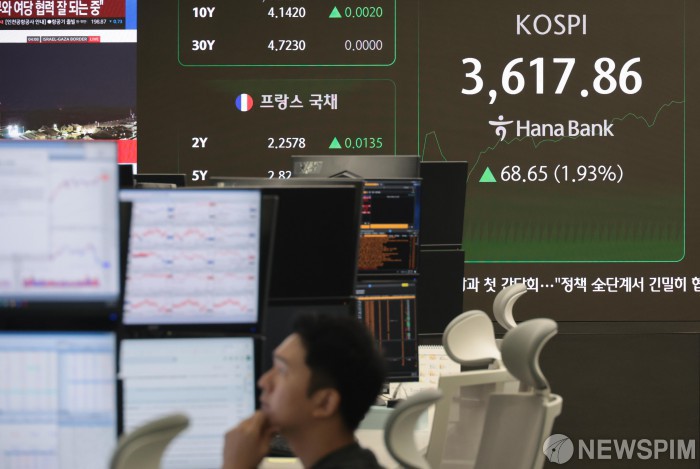 [서울=뉴스핌] 이길동 기자 = 10일 오전 서울 중구 하나은행 딜링룸에 긴 추석 연휴를 마치고 개장한 코스피-코스닥 지수 및 달러/원 환율이 표시되어 있다. 이날 코스피는 전 거래일보다 48.90p(1.38%) 오른 3598.11에 출발해 장중 3600을 넘어섰다. 코스닥 지수는 전 거래일보다 4.61p(0.54%) 상승한 858.86에 거래를 시작했다. 서울 외환시장에서 달러/원 환율은 전장보다 23.0원 오른 1423.0원에 개장했다.2025.10.10 gdlee@newspim.com