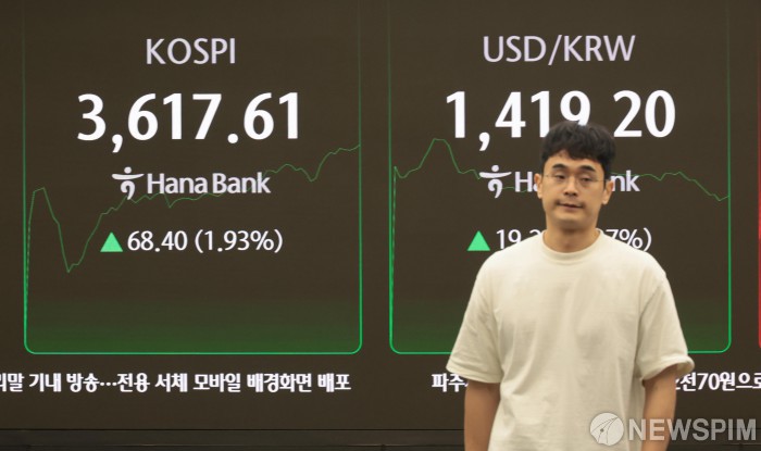 [서울=뉴스핌] 이길동 기자 = 10일 오전 서울 중구 하나은행 딜링룸에 긴 추석 연휴를 마치고 개장한 코스피-코스닥 지수 및 달러/원 환율이 표시되어 있다. 이날 코스피는 전 거래일보다 48.90p(1.38%) 오른 3598.11에 출발해 장중 3600을 넘어섰다. 코스닥 지수는 전 거래일보다 4.61p(0.54%) 상승한 858.86에 거래를 시작했다. 서울 외환시장에서 달러/원 환율은 전장보다 23.0원 오른 1423.0원에 개장했다.2025.10.10 gdlee@newspim.com