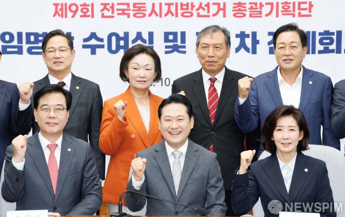 [서울=뉴스핌] 윤창빈 기자 = 장동혁 국민의힘 대표, 송언석 원내대표, 나경원 위원장 등 참석자들이 10일 오전 서울 여의도 국회에서 열린 지방선거총괄기획단 임명장 수여식 및 제1차 전체회의에서 기념촬영을 하고 있다. 2025.10.10 pangbin@newspim.com