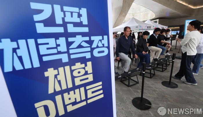 [서울=뉴스핌] 김학선 기자 = 10일 서울 동대문 DDP 어울림 광장에서 열린 더 건강한 서울 9988, 체력 회복 챌린지 행사에서 참가자들이 체력측정을 하고 있다. 2025.10.10 yooksa@newspim.com