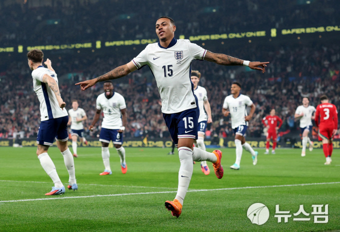 [런던 로이터=뉴스핌] 손지호 기자 = 잉글랜드 모건 로저스가 10일(한국시간) 영국 런던의 웸블리 스타디움에서 열린 웨일스와 평가전에서 선제골을 넣고 기뻐하고 있다. 2025.10.10 thswlgh50@newspim.com |