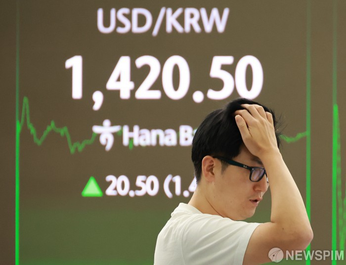 [서울=뉴스핌] 김학선 기자 = 달러/원 환율이 1420원대로 급등한 10일 오후 서울 중구 하나은행 딜링룸 전광판에 달러/원 환율이 표시돼 있다. 2025.10.10 yooksa@newspim.com