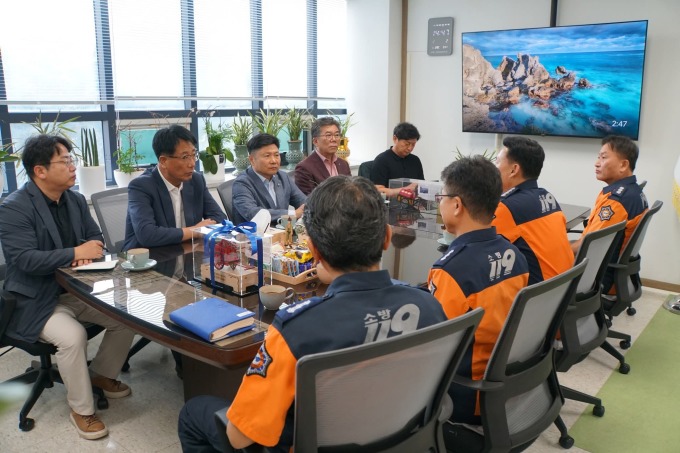 송탄소방서를 찾아 명절에도 시민들의 안전을 위해 고생하고 있는 소방공무원들의 노고를 격려하고 있는 홍기원 국회의원과 지역 의원들 모습[사진=의원사무실]