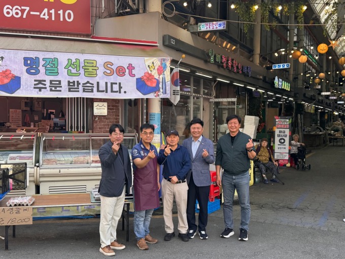추석명절을 맞아 전통시장을 찾은 홍기원 국회의원이 상인들과 기념촬영을 하고 있다[사진=의원사무실]