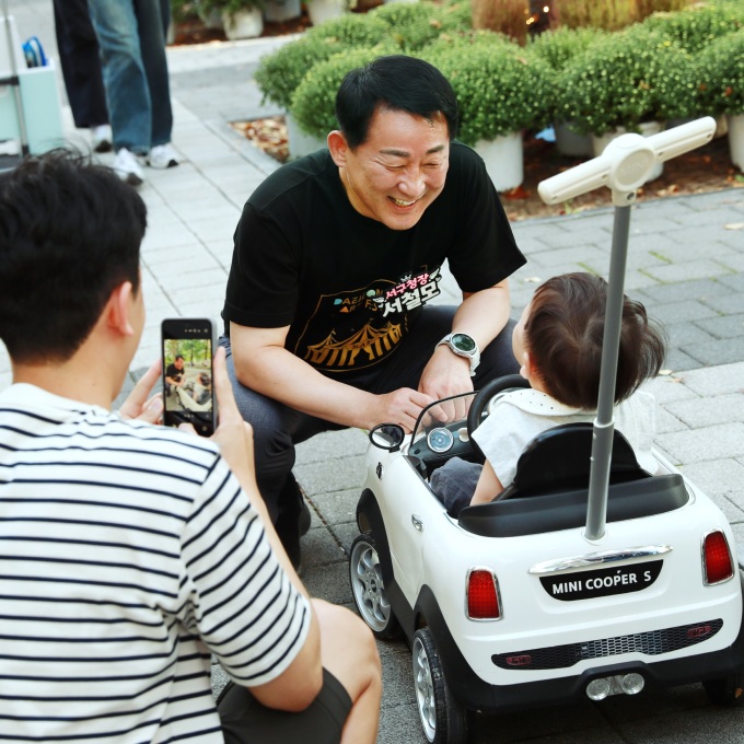 서철모 대전 서구청장이 '2025 대전 서구 아트페스티벌' 축제장을 찾은 아이와 눈맞춤을 하고 있다. [사진=대전 서구] 2025.10.12 jongwon3454@newspim.com