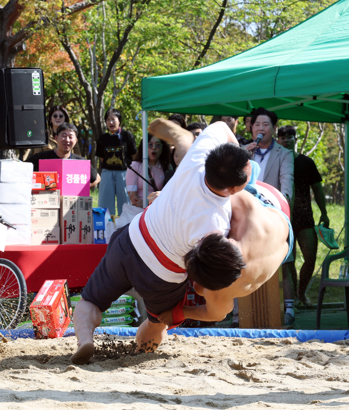 지난 11일 샘머리공원 특설씨름장에서 진행된 대전광역시 서구청장배 생활체육 민속씨름대회에서 기량을 뽐내고 있는 서철모 서구청장. [사진=대전 서구] 2025.10.12 jongwon3454@newspim.com