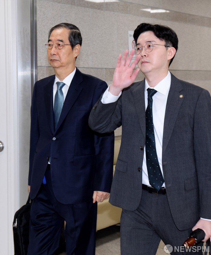 [서울=뉴스핌] 양윤모 기자 =내란 우두머리 방조 혐의를 받는 한덕수 전 국무총리가 13일 오전 2차 공판에 참석하기 위해 변호인과 함께 서울중앙지법에 출석하고 있다. 2025.10.13 yym58@newspim.com