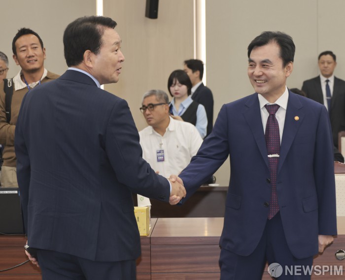 [서울=뉴스핌] 국회사진기자단 = 2025 국정감사 첫날인 13일 오전 서울 용산구 국방부 청사에서 열린 국방위원회의 국방부 등에 대한 국정감사에서 안규백 국방부 장관과 성일종 국회 국방위원장이 악수를 나누고 있다. 2025.10.13 photo@newspim.com