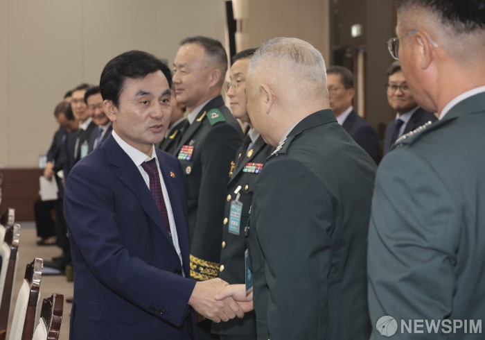 [서울=뉴스핌] 국회사진기자단 = 2025 국정감사 첫날인 13일 오전 서울 용산구 국방부 청사에서 열린 국방위원회의 국방부 등에 대한 국정감사에서 안규백 국방부 장관이 국방부 관계자들과 악수를 나누고 있다. 2025.10.13 photo@newspim.com