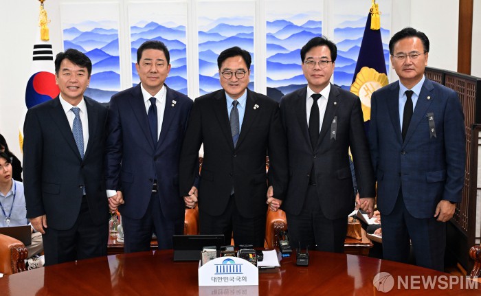 [서울=뉴스핌] 류기찬 기자 = 우원식 국회의장과 여야 원내대표가 13일 오후 서울 여의도 국회에서 열린 국회의장 주재 여야 원내대표 회동에서 기념촬영을 하고 있다. 왼쪽부터 문진석 더불어민주당 원내운영수석부대표, 김병기 더불어민주당 원내대표, 우원식 국회의장, 송언석 국민의힘 원내대표, 유상범 국민의힘 원내운영수석부대표. 2025.10.13 ryuchan0925@newspim.com |