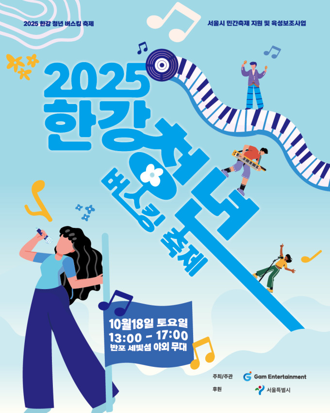 '2025 한강 청년 버스킹 축제'는 청년 뮤지션과 시민들이 함께 어우러지는 가을 야외 축제다. 10월 18일 오후 1시부터 5시까지 4시간에 걸쳐 열리는반포한강공원 세빛섬 야외 무대에서 열린다. 이 축제는 감엔터테인먼트가 주최하고, 대중음악 현장에서 활약하는 청년 싱어송라이터들이 참여한다.