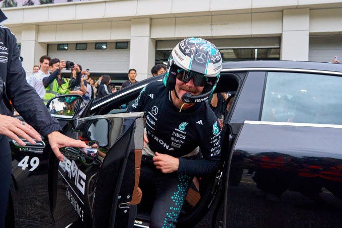 '메르세데스-AMG 페트로나스 F1' 팀 소속 드라이버 '발테리 보타스'가 지난 12일 경기도 용인시 AMG 스피드웨이에서 진행된 '피치스 런 유니버스 2025'에 참가해, 메르세데스-AMG GT 4도어 쿠페 차량에서 내리고 있다. [사진=벤츠코리아]