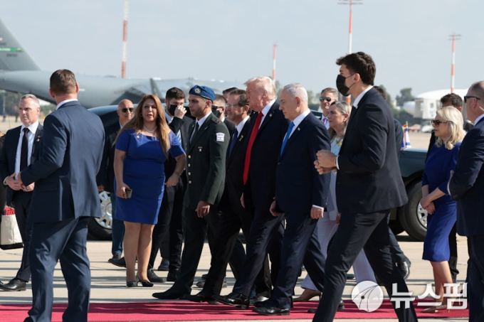 [텔아비브 로이터=뉴스핌] 장일현 특파원 = 도널드 트럼프 미국 대통령이 13일(현지 시간) 이스라엘 벤구리온 국제공항에 도착해 베냐민 네타냐후 이스라엘 총리의 영접을 받고 있다. 트럼프 대통령은 이날 이스라엘 의회에서 연설할 예정이다. 2015.10.13. ihjang67@newspim.com |