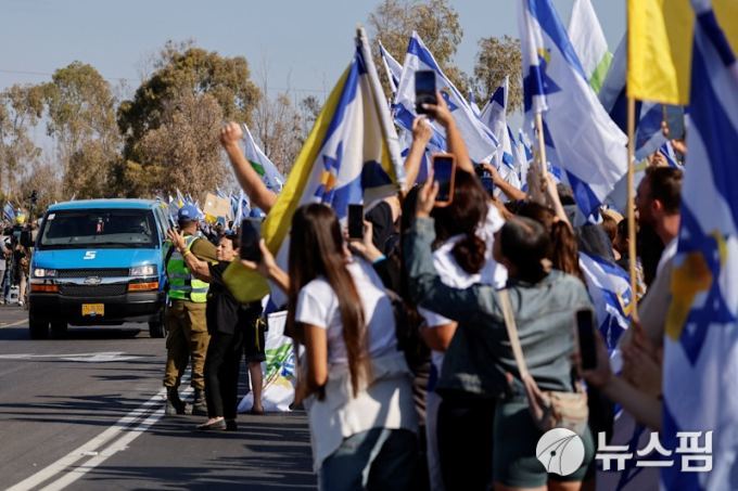 이스라엘 생존 인질을 실은 차량이 13일(현지 시간) 이스라엘 남부에 있는 군기지를 향해 달려가자 시민들이 국기를 흔들며 환영하고 있다. [사진=로이터 뉴스핌] |