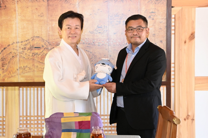 조규일 경남 진주시장(왼쪽)이 12일 준주성 중영에서 마르시우 켄지 이토 브라질 상파울루 시의원에게 진주 관광 관광 캐릭터인 하모를 선사하고 있다. [사진=진주시] 2025.10.13