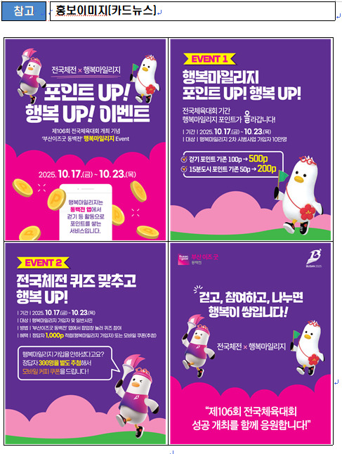 [부산=뉴스핌] 남동현 기자 = 부산시가 제106회 전국체육대회를 맞아 시민 참여형 포인트 적립제 '행복마일리지' 특별 이벤트를 진행한다.