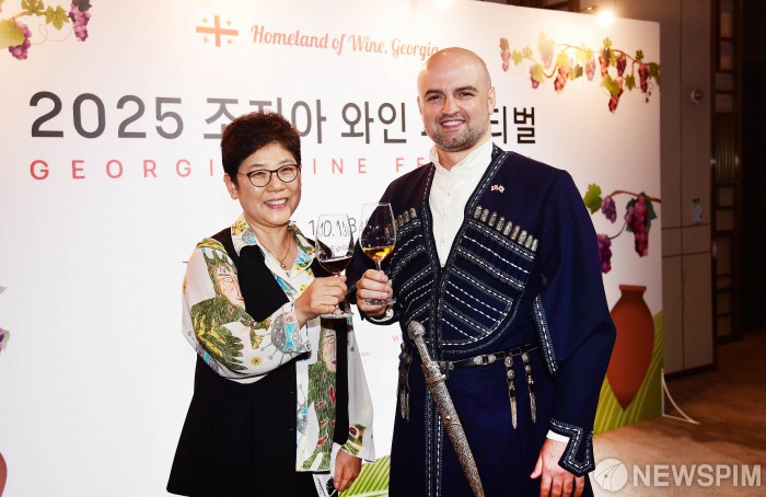 [서울=뉴스핌] 양윤모 기자 = 타라쉬 파파스쿠아 주한 조지아 대사와 와인21 최성순 대표가 13일 저녁 앰배서더 서울 풀만 호텔에서 개최된 8천 년의 역사의 '2025 조지아 와인 페스티벌'에 참석해 건배를 하고 있다. [사진=와인21] 2025.10.14 yym58@newspim.com
