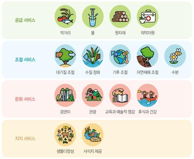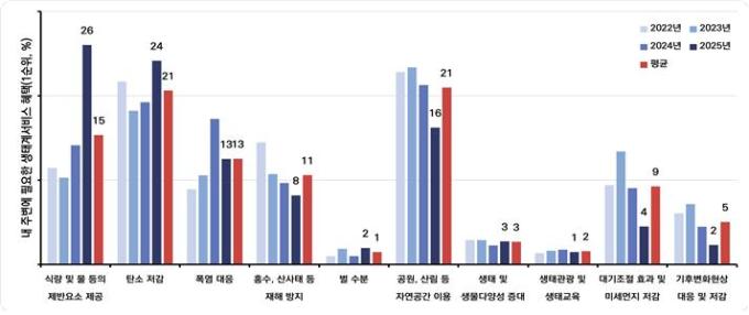 거주지 주변에서 가장 필요하다고 생각하는 생태계서비스는 '식량 및 물 등의 제반요소 제공'(26%)이었고, 다음으로 '탄소 저감'(24%), '공원·산림 등 자연공간 이용'(16%) 순이었다. '식량 및 물 등의 제반요소 제공'은 지난해 4위에서 1위로 상승(14→26%)했다. 설문조사 직전에 발생한 경북 및 경남 지역의 대형 산불이 이에 영향을 미친 것으로 분석됐다.