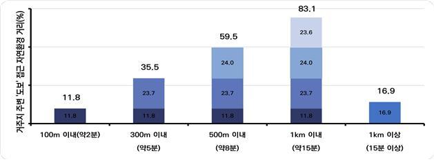 걸어서 자주 방문하는 자연환경이 거주지로부터 얼마나 떨어져 있는지에 대한 조사는 올해 처음 실시됐다. '300m(약5분) 이내' 35.5%, '500m(약8분) 이내' 59.5%, '1㎞(약15분) 이내'는 83.1%로 나타났다. 자연환경 방문 빈도를 묻는 질문에는 '주 1회 이상'이 42%를 기록했다.