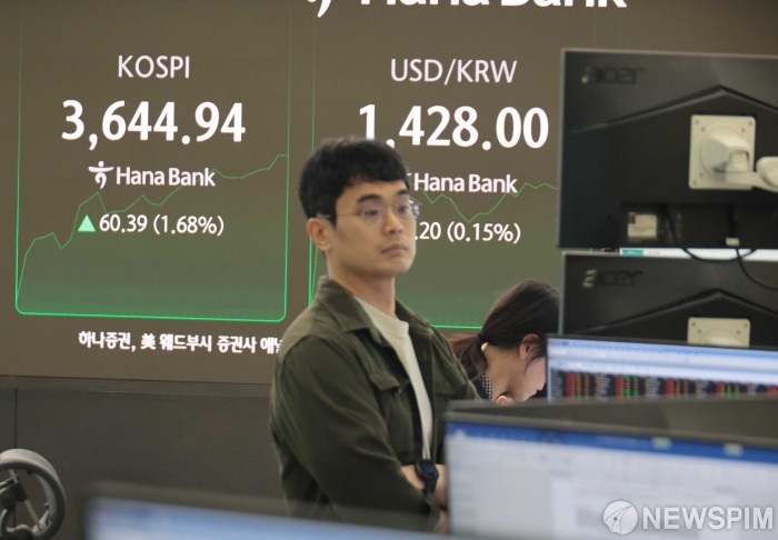 [서울=뉴스핌] 이길동 기자 = 삼성전자 호실적·美기술주 훈풍에 코스피가 3600 재돌파한 가운데 14일 오전 서울 중구 하나은행 딜링룸에 코스피-코스닥 지수 및 달러/원 환율이 표시되어 있다. 이날 코스피는 전 거래일보다 19.57p(0.55%) 오른 3604.12에 코스닥 지수는 전 거래일보다 4.88p(0.57%) 오른 865.37에 거래를 시작했다. 서울 외환시장에서 달러/원 환율은 전장보다0.7원 오른 1426.5원원에 개장했다.2025.10.14gdlee@newspim.com