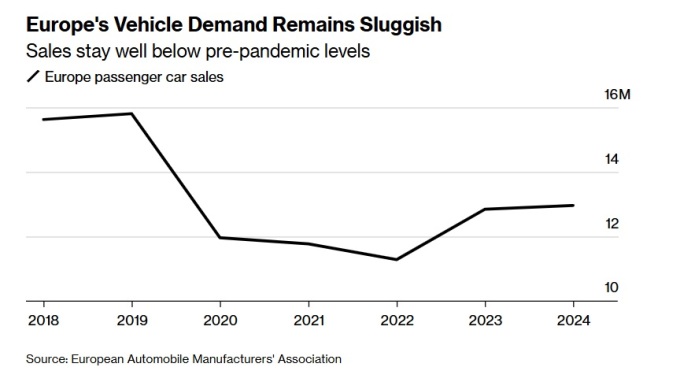 유럽의 승용차 판매 동향. 유럽내 승용차 판매는 코로나 팬데믹 이전 수준을 회복하지 못하고 있다. [사진=블룸버그, 출처 = 유럽자동차협회]