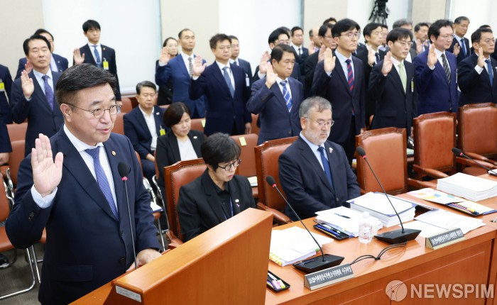 [서울=뉴스핌] 김학선 기자 = 윤호중 행정안전부 장관이 14일 서울 여의도 국회에서 열린 행정안전위원회의 행정안전부 등에 대한 국정감사에서 증인선서를 하고 있다. 2025.10.14 yooksa@newspim.com