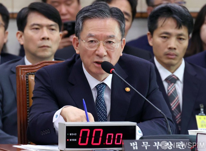 [서울=뉴스핌] 윤창빈 기자 = 정성호 법무부 장관이 14일 오전 서울 여의도 국회에서 열린 법제사법위원의 법무부 등에 대한 국정감사에서 의원 질문에 답변하고 있다. 2025.10.14 pangbin@newspim.com