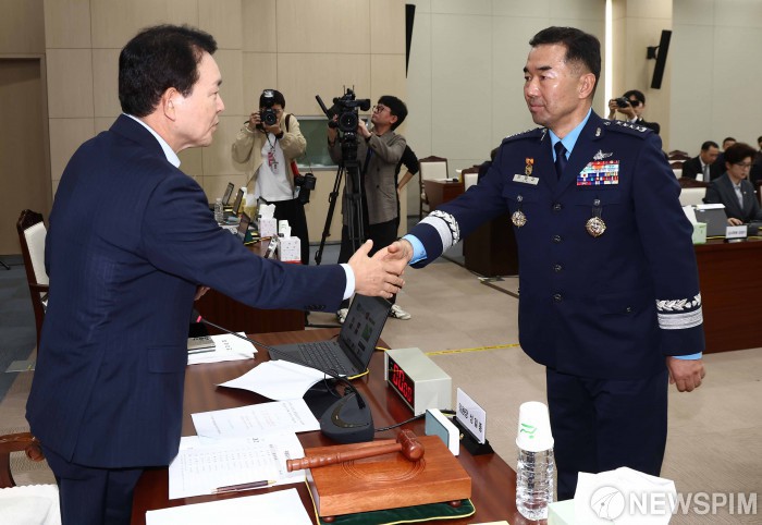 [서울=뉴스핌] 국회사진기자단 = 진영승 합동참모본부 의장이 14일 오전 서울 용산구 합동참모본부에서 열린 2025년 국정감사에서 성일종 국방위원장에게 증인 선서문을 제출한 뒤 악수하고 있다. 2025.10.14 photo@newspim.com