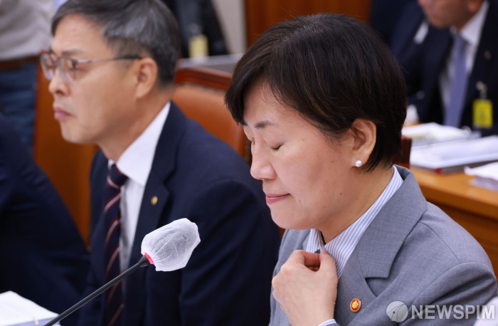 [서울=뉴스핌] 김학선 기자 = 송미령 농림축산식품부 장관이 14일 서울 여의도 국회에서 열린 농림축산식품해양수산위원회 국정감사에서 의원질의를 경청하며 옷 단추를 풀고 있다. 2025.10.14 yooksa@newspim.com
