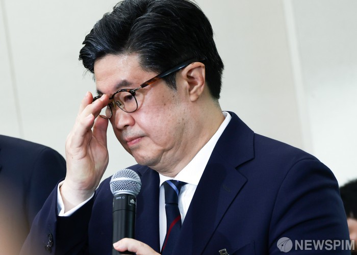 [서울=뉴스핌] 최지환 기자 = 김병주 MBK파트너스 회장이 14일 오후 서울 여의도 국회 정무위원회에서 열린 공정거래위원회, 개인정보보호위원회 등 국정감사에서 안경을 고쳐쓰고 있다. 2025.10.14 choipix16@newspim.com