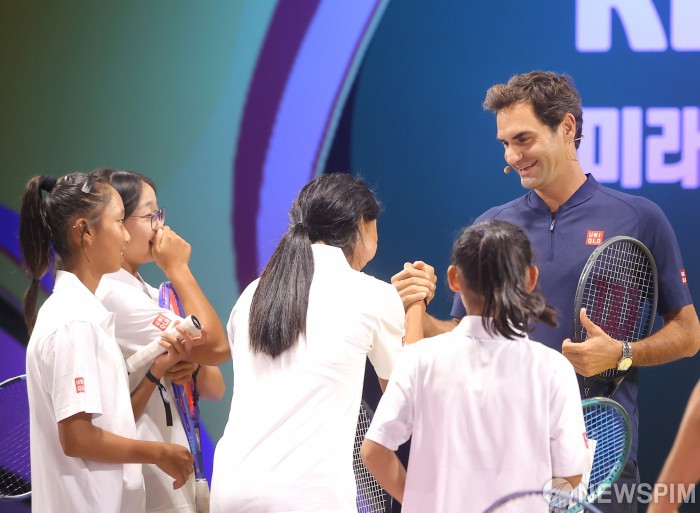 [서울=뉴스핌] 글로벌 패션 브랜드 유니클로(UNIQLO)가 글로벌 이벤트 시리즈인 ‘로저 페더러와 함께하는 세계 여행(Around the World with Roger Federer)’을 지난 13일 오후 서울에서 개최했다. 로저 페더러가 유소년 선수와 코칭 세션을 하며 유소년 선수들과 하이파이브를 하고 있다. [사진=유니클로] 2025.10.14 photo@newspim.com