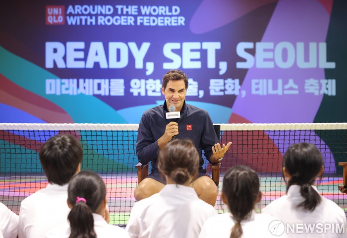 [서울=뉴스핌] 글로벌 패션 브랜드 유니클로(UNIQLO)가 글로벌 이벤트 시리즈인 ‘로저 페더러와 함께하는 세계 여행(Around the World with Roger Federer)’을 지난 13일 오후 서울에서 개최했다. 로저 페더러가 유소년 선수들과 진행한 코칭 세션에서 유소년 선수의 질문에 답하고 있다. [사진=유니클로] 2025.10.14 photo@newspim.com