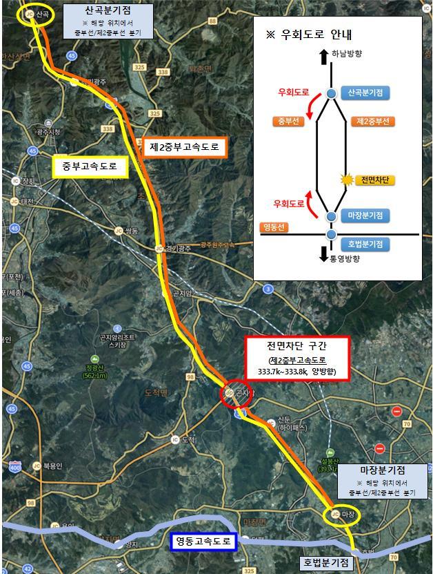 제2중부고속도로 차단 시간대 우회도로 노선도.[사진=한국도로공사 서울경기본부]