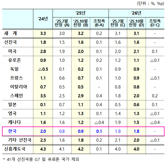 주요 7개국(G7)과 유로존을 제외한 기타 선진국은 일부 국가의 대미 무역 협상 타결 등에 힘입어 올해 성장률이 지난 전망 대비 0.2%p 상향된 1.8%로 전망됐다. 내년 전망은 0.1%p 하락한 2.0%로 예상됐다.