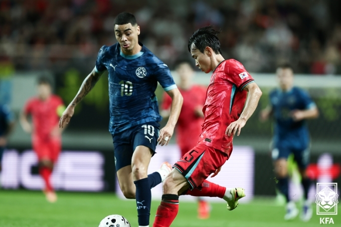 [서울=뉴스핌] 손지호 기자 = 김문환(오른쪽)이 14일 서울월드컵경기장에서 열린 파라과이와의 친선경기에서 상대 선수를 앞에 둔 채 돌파를 시도하고 있다. [사진=대한축구협회] 2025.10.14 thswlgh50@newspim.com |