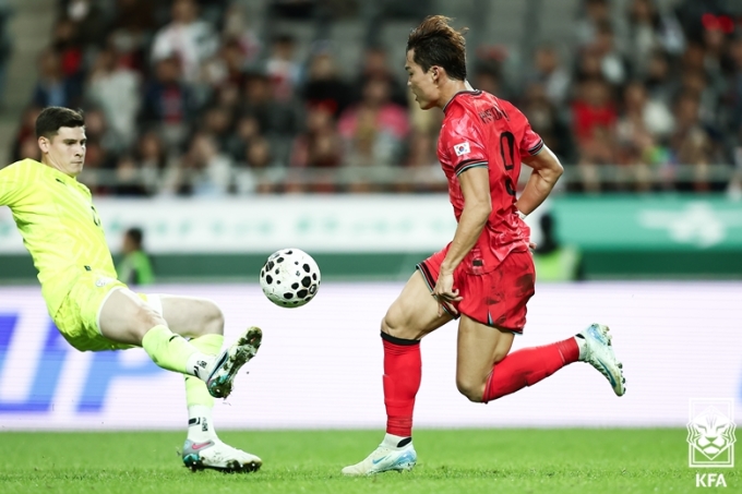 [서울=뉴스핌] 손지호 기자 = 오현규(오른쪽)가 14일 서울월드컵경기장에서 열린 파라과이와의 친선경기에서 상대 골키퍼를 제치는 모습. [사진=대한축구협회] 2025.10.14 thswlgh50@newspim.com |