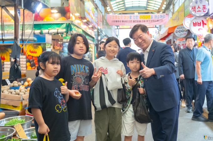 박승원 광명시장이 지난 9월 30일 광명새마을시장을 찾은 아이들과 기념사진을 촬영하고 있다. [사진=광명시] |