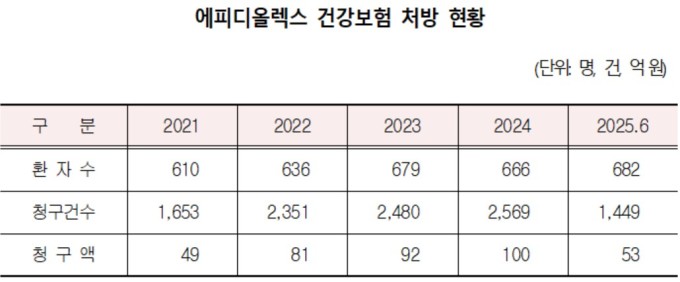 연도별 에피디올렉스 건강보험 처방 현황은 2022년 2351건, 2023년 2480건, 2024년 2569건으로 매년 증가했다. 건강보험 청구액도 2022년 81억원에서 2023년 92억원으로 증가 추세를 보이다가 지난해 100억원을 돌파했다. 올해 상반기 에피디올렉스 청구 건수는 1449건, 청구액은 53억원이다.