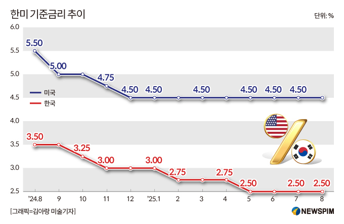 미국 기준금리는 현재 연 4.00∼4.25% 수준이다. 한국의 기준금리는 2.5%로 한미간 금리격차는 1.75%p 다. 월가의 전망대로 연준이 연내 2회 총 0.50%p를 추가 인하하면 3.50∼3.75%가 된다.