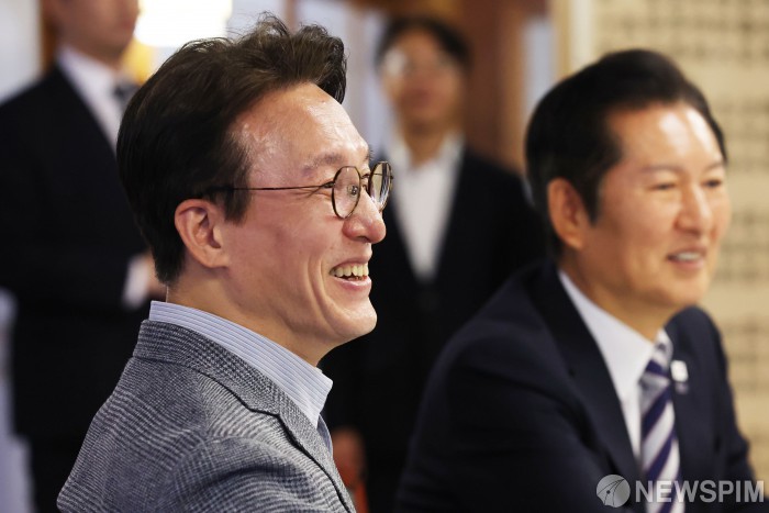 [서울=뉴스핌] 양윤모 기자 = 김민석 국무총리가 지난 12일 서울 종로구 삼청동 국무총리 서울공관에서 열린 '제4차 고위당정협의회'에 앞서 참석자들과 대화를 나누고 있다. 2025.10.12 yym58@newspim.com
