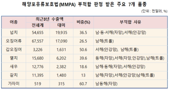 지난 8월 미국 상무부 산하 국립해양대기청(NOAA)은 한국의 14개 어업에서 포획한 오징어, 멸치, 갑오징어, 넙치, 대게 등 수산물 29종에 대해 2026년 1월 1일부터 수출 불가 판정을 내렸다. 구체적인 사유로는 현재 한국의 어획 방법(자망, 안강망, 트롤 등)으로는 상괭이, 참돌고래, 낫돌고래 등의 해양포유류가 혼획될 위험이 높고, 기존 조치로는 혼획 완화 가능성이 낮다고 평가했다.