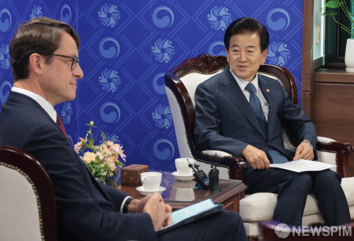 [서울=뉴스핌] 이길동 기자 = 정동영 통일부 장관이 15일 오전 서울 종로구 정부서울청사에서 필립 베르투 주한프랑스대사를 접견하고 있다. 2025.10.15 gdlee@newspim.com