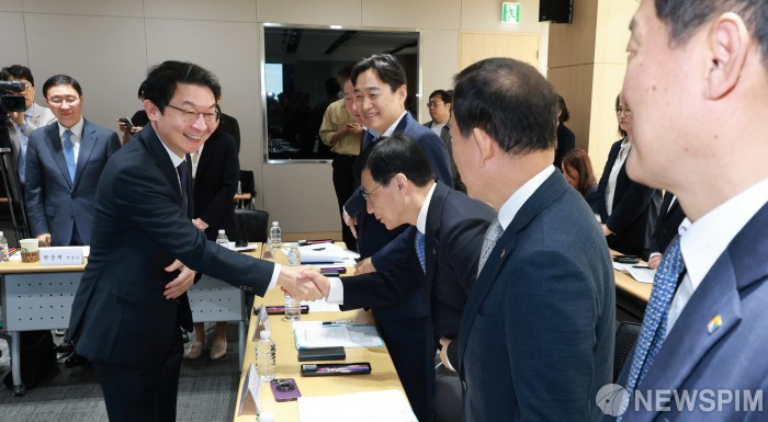 [서울=뉴스핌] 김학선 기자 = 이억원 금융위원장이 15일 서울 중구 서민금융진흥원에서 열린 '소비자·서민금융 대전환을 위한 간담회'에 참석해 은행·생보·손보·여신·저축은행·금투 협회장 등 참석자들과 인사를 하고 있다. 2025.10.15 yooksa@newspim.com