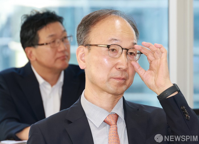 [서울=뉴스핌] 김학선 기자 = 양혁승 새도약기금 대표이사가 15일 서울 중구 서민금융진흥원에서 열린 '소비자·서민금융 대전환을 위한 간담회'에 참석해 이억원 금융위원장의 발언을 듣고 있다. 2025.10.15 yooksa@newspim.com